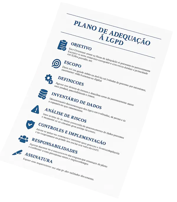 Você vai receber um pacote completo, pronto para ser usado no seu dia a dia, com o passo a passo, os documentos e as ferramentas que um escritório jurídico precisa para sair da incerteza e alcançar conformidade com segurança.